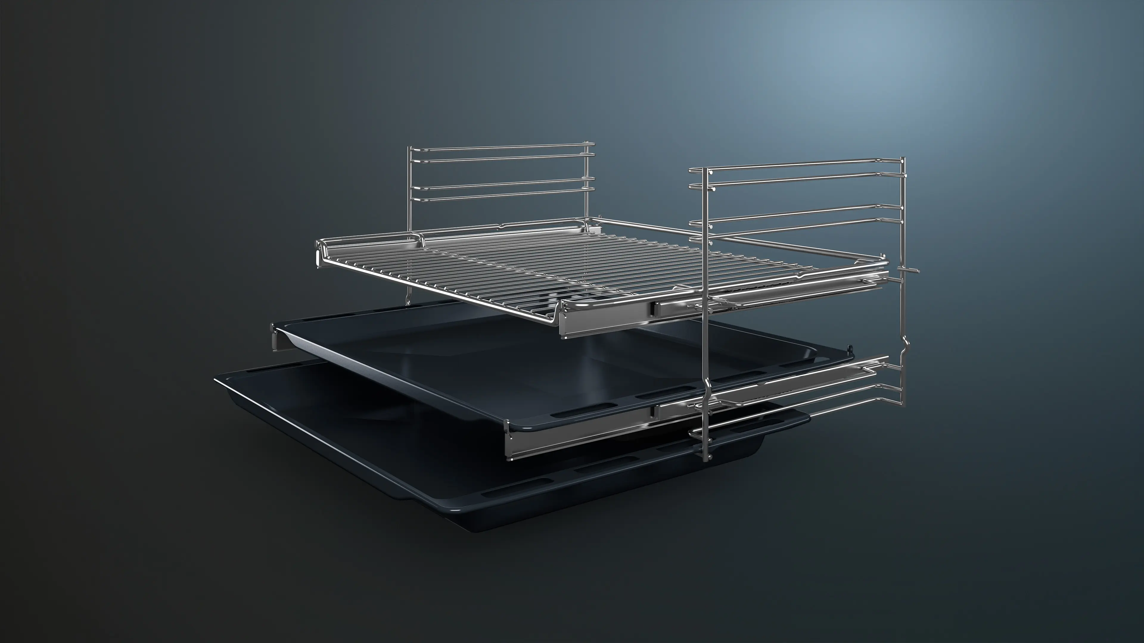 Telescopic rail system on two levels: easy and safe handling of trays and racks.