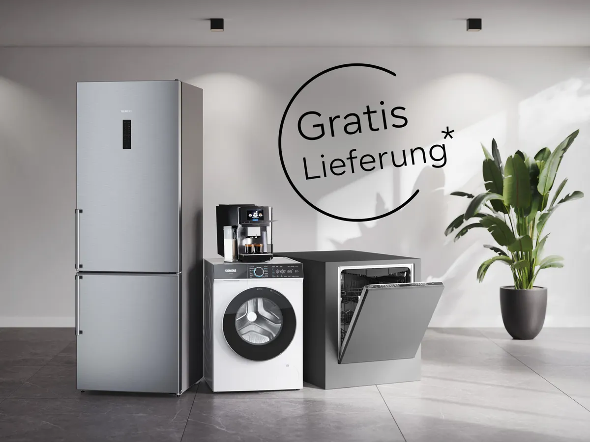 *Gültig für Käufe im Aktionszeitraum 02.03. - 27.04.2026 im Siemens Online Shop. Gratis Lieferung bis zum Aufstellungsort im Wert von € 59,–, ausgenommen SidebySide und FrenchDoor. Die Abbildungen sind Symbolbilder.