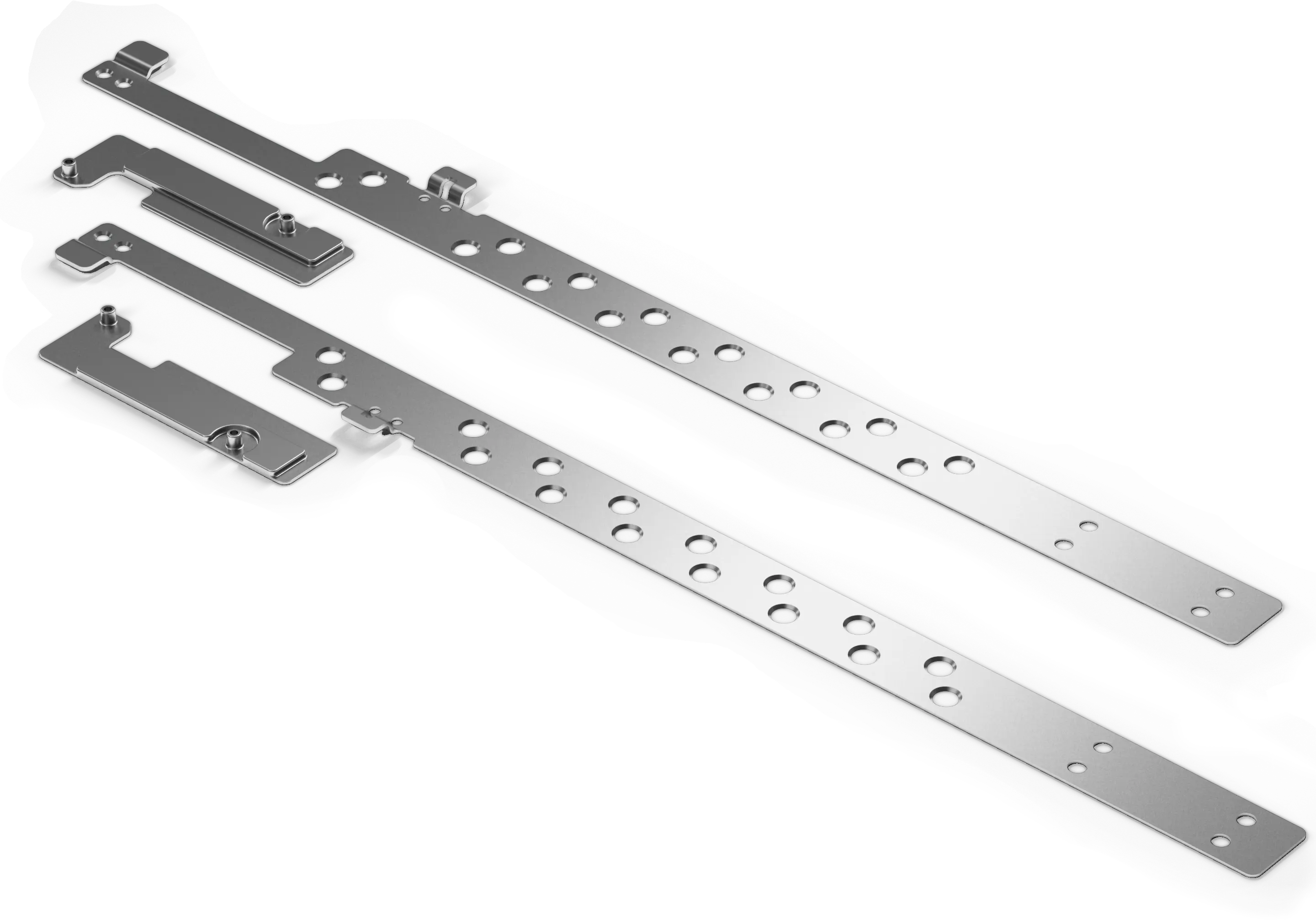 Le kit comprend : 2 rails de raccordement (métalliques) pour les côtés droit et gauche, 2 supports de montage (métalliques) pour les côtés droit et gauche, le matériel de montage et les instructions d'installation