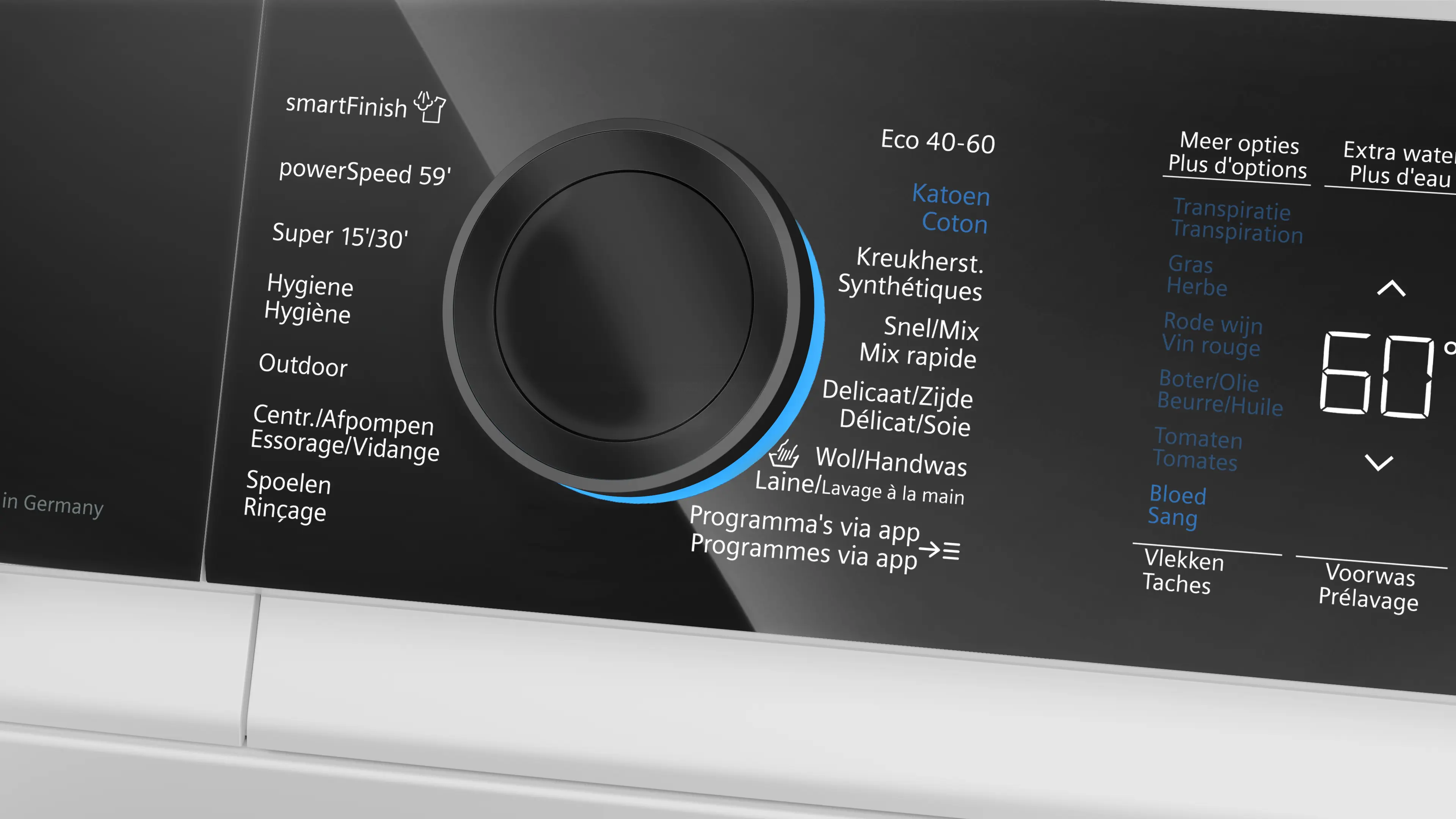 Vitesse d'essorage max.Note de bas de page 1 : La vitesse d'essorage maximale est automatiquement réduite en cas de déséquilibre.: 1400 tours/min
