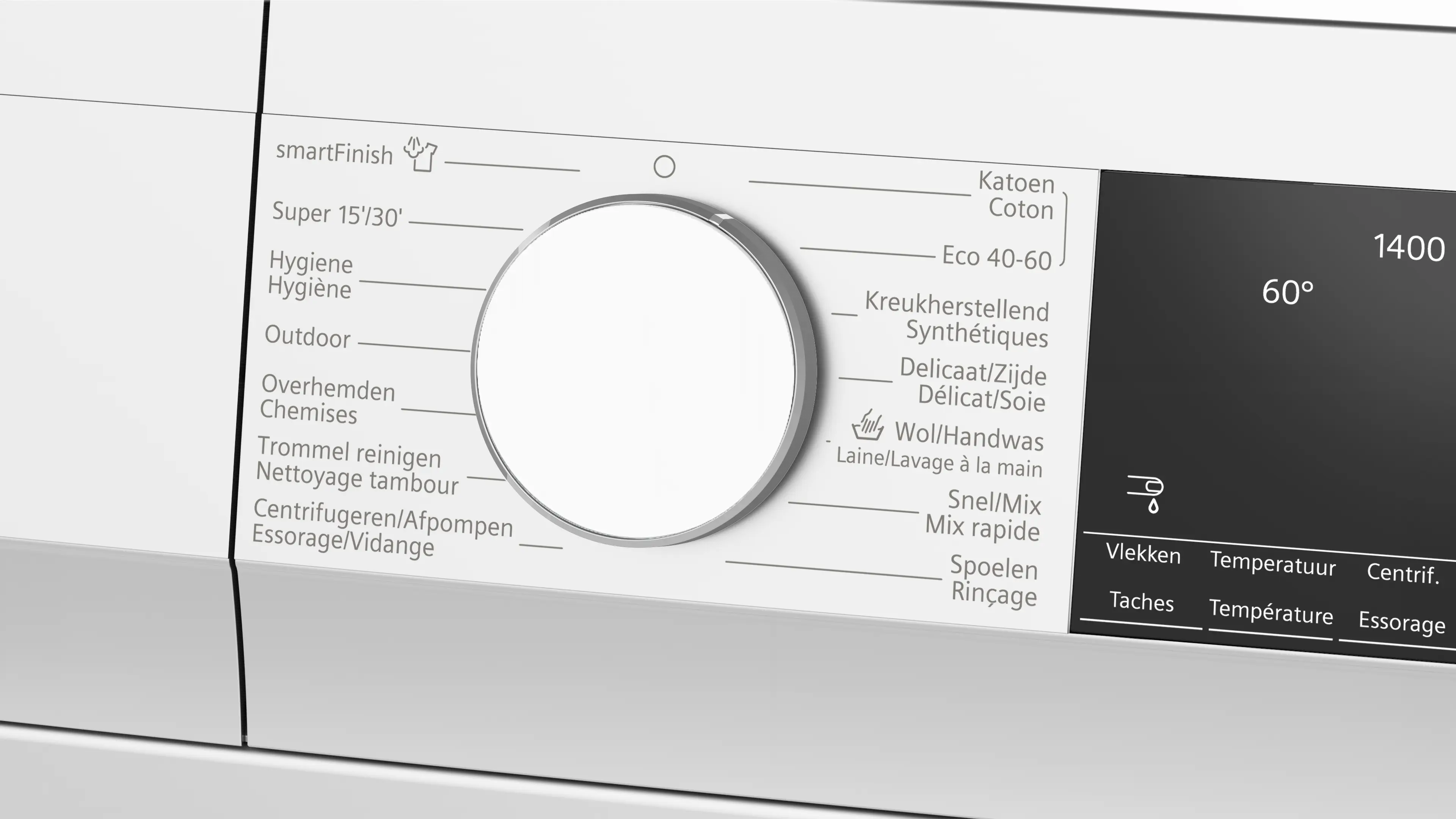 Vitesse d'essorage max.Note de bas de page 1 : La vitesse d'essorage maximale est automatiquement réduite en cas de déséquilibre.: 1400 tours/min