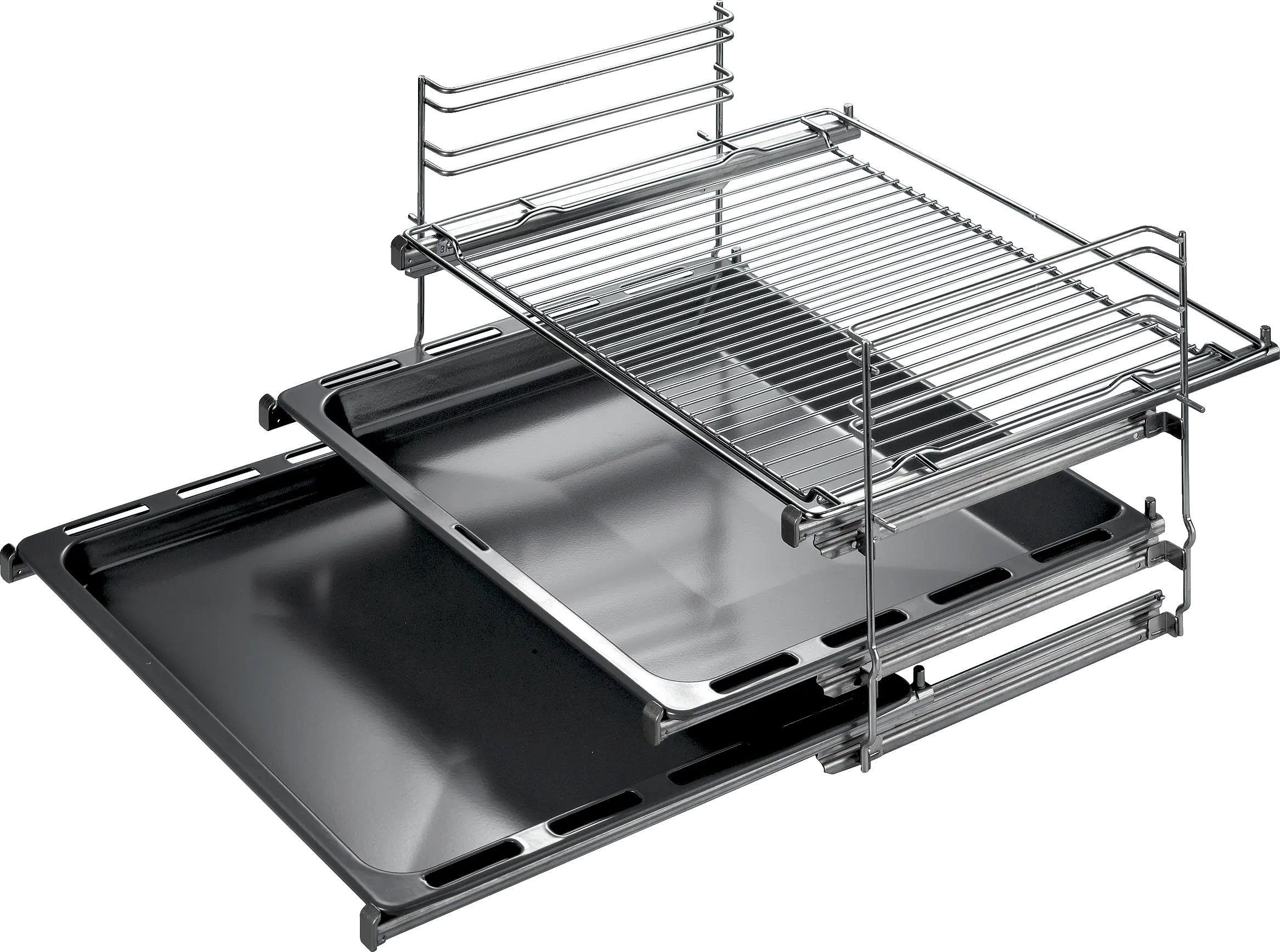 Met de telescopische rails kunnen pannen en plateaus op meerdere niveaus uit de oven worden getrokken zonder te kantelen