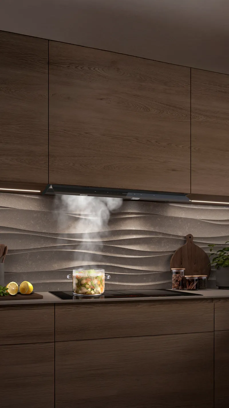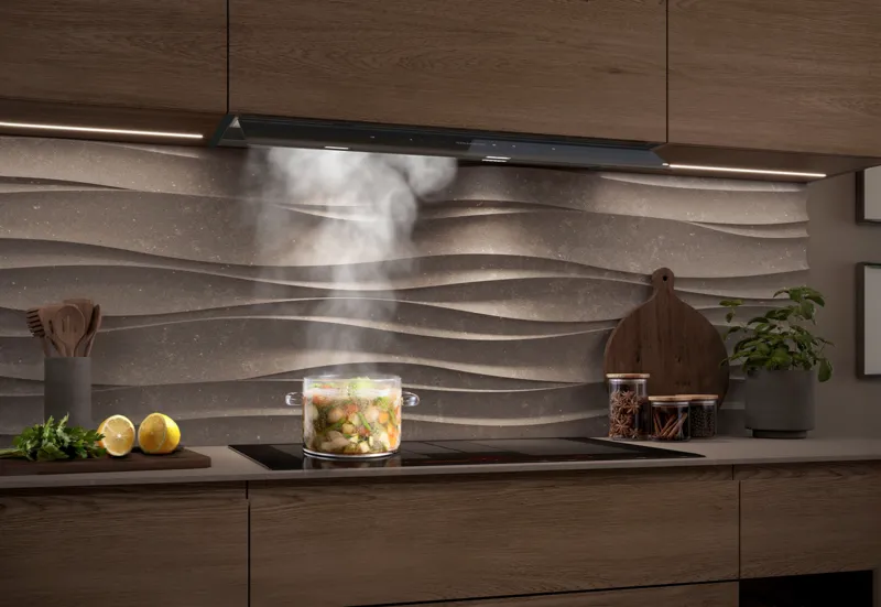 La hotte design intégrée a été conçue pour être pratiquement invisible. Au repos, la hotte reste invisible. Elle est faite sur mesure pour tous ceux qui apprécient le design minimaliste. Cette hotte puissante, mais exceptionnellement silencieuse, préserve le caractère de votre cuisine – et maintient l'air frais et sans odeurs.Une symphonie de silence et de sophistication.