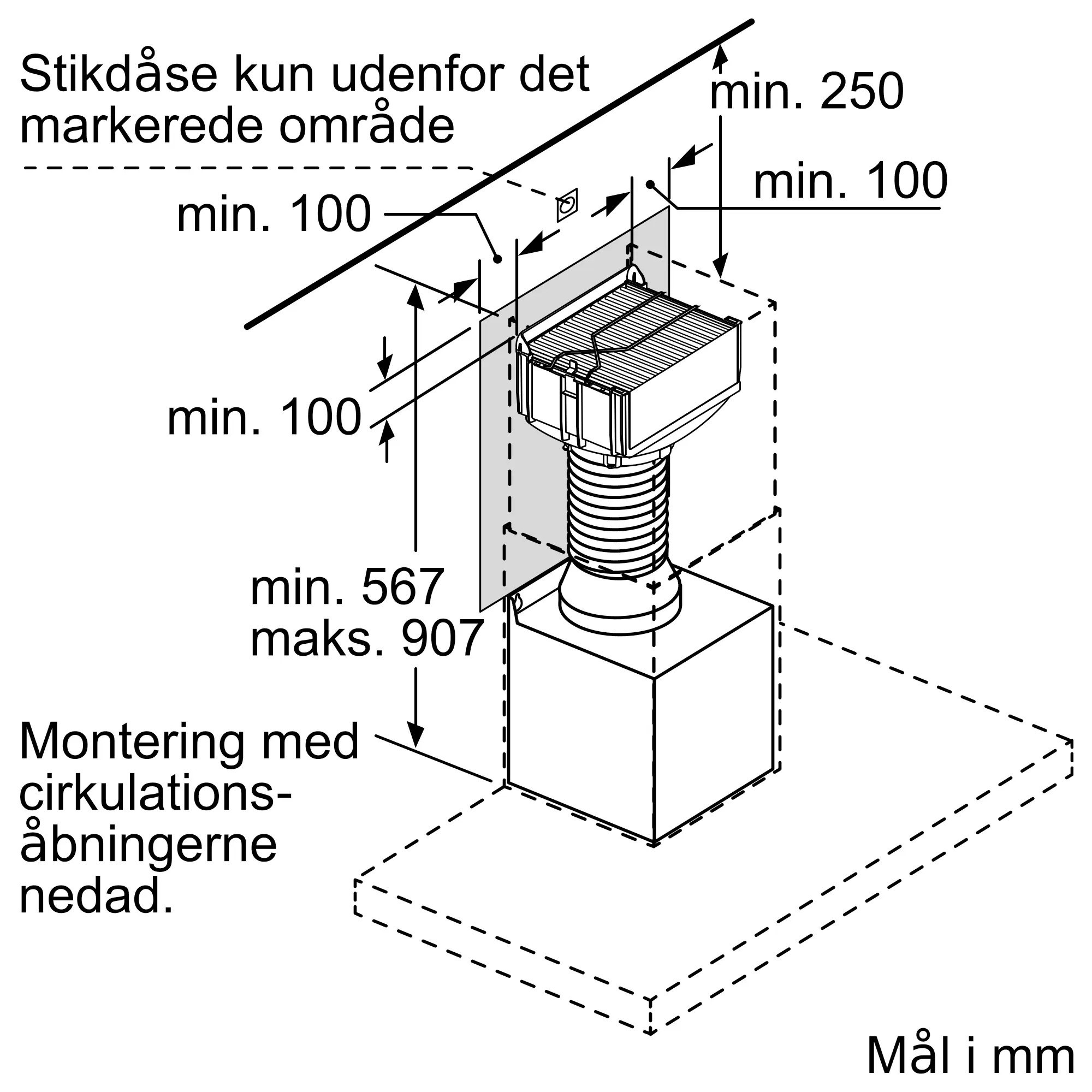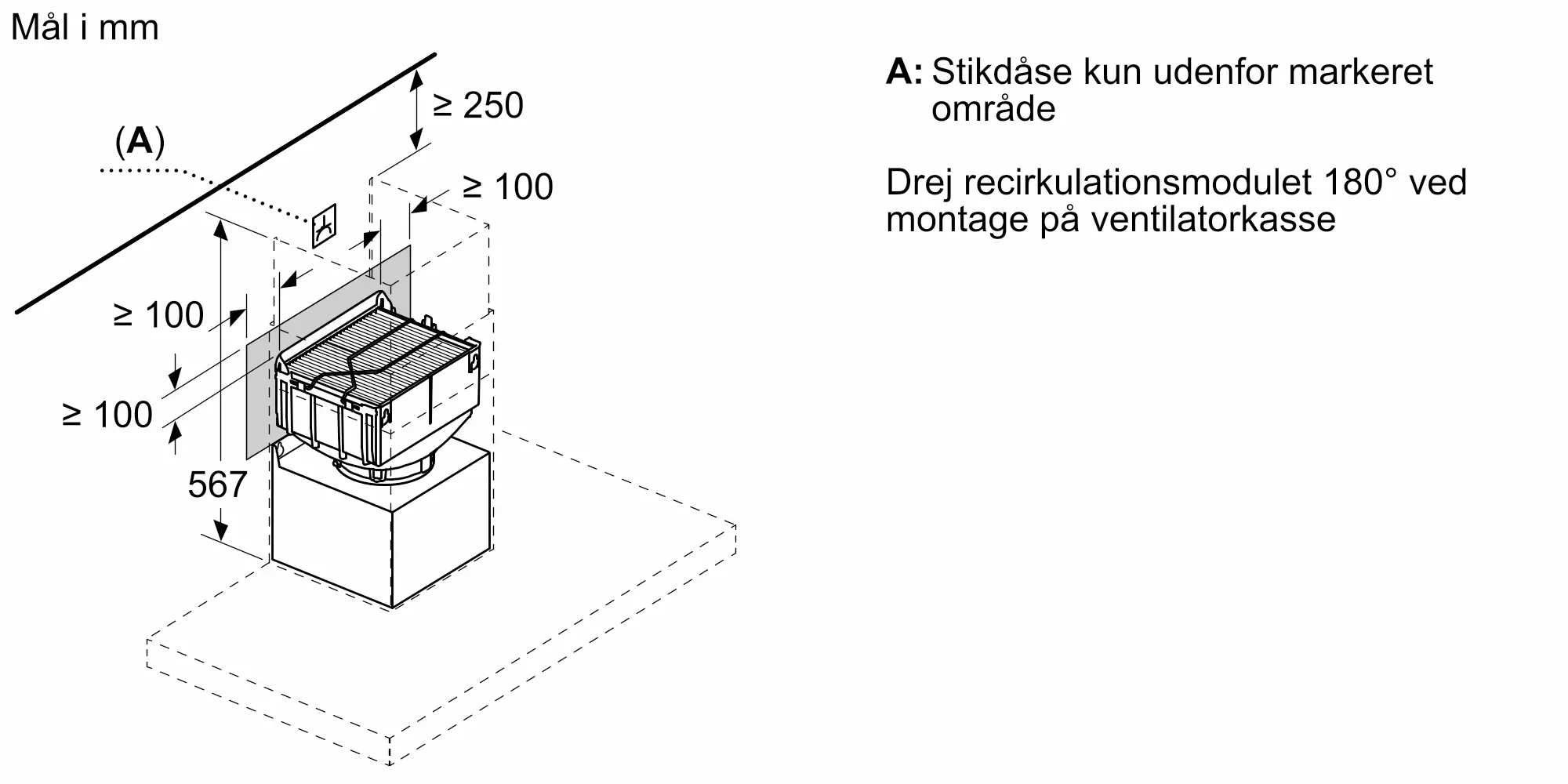 Integreret design: integreret CleanAir Plus recirkulationssæt er installeret usynligt i kanalen. Installations i forskellige højder er muligt