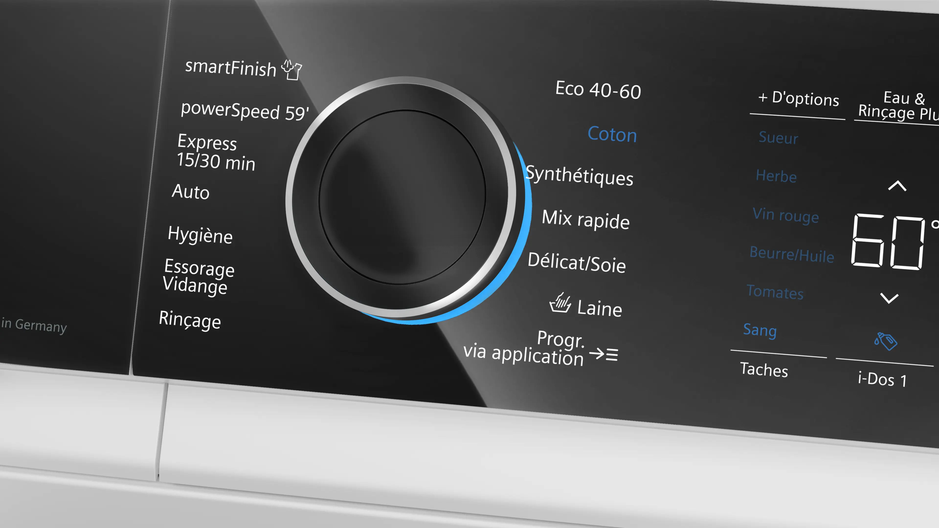 Vitesse d'essorage max.Note de bas de page 1: La vitesse d'essorage maximale est automatiquement réduite en cas de déséquilibre.: 1600 tours/min