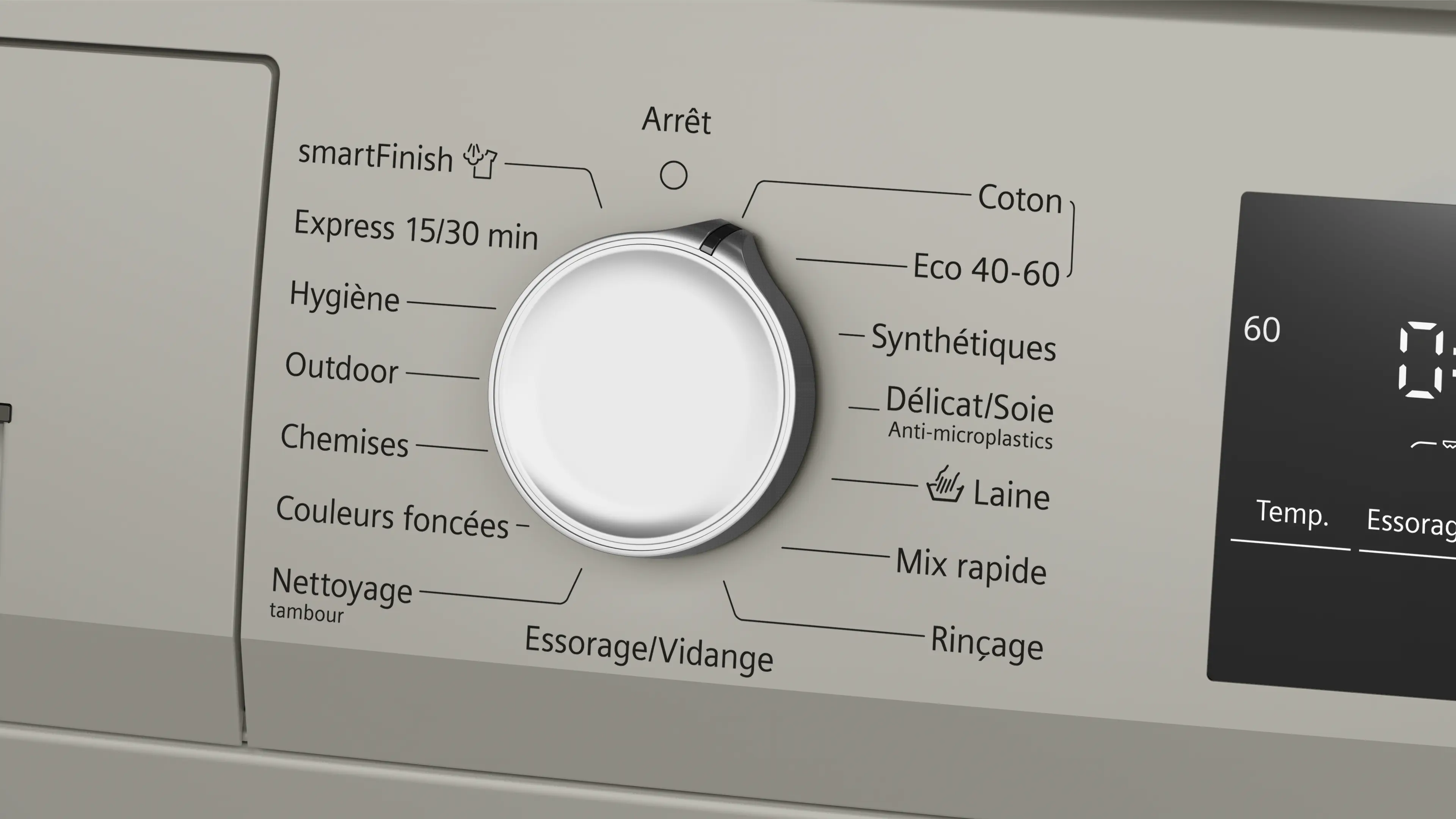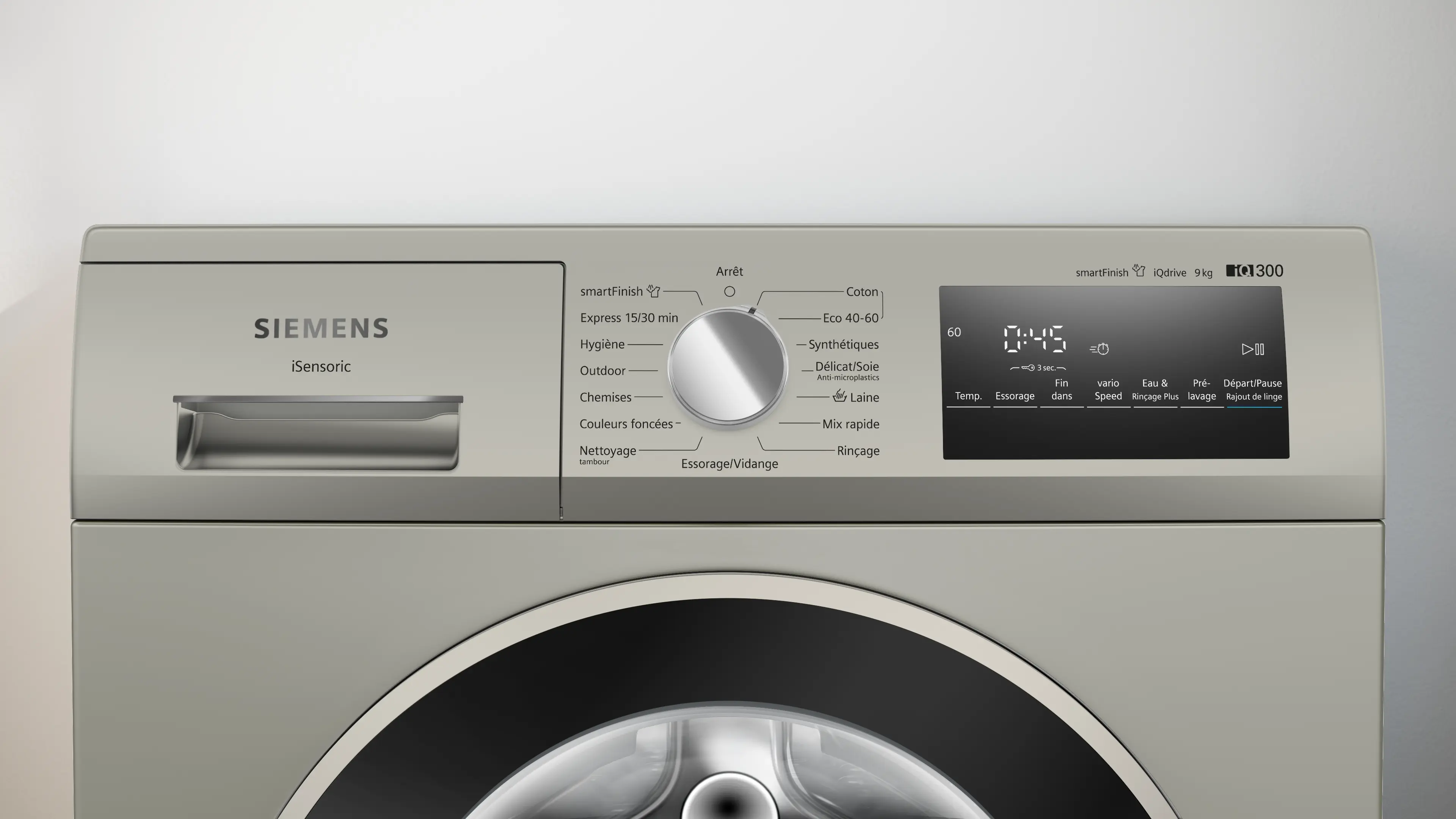 Vitesse d'essorage max.Note de bas de page 1: La vitesse d'essorage maximale est automatiquement réduite en cas de déséquilibre.: 1400 tours/min