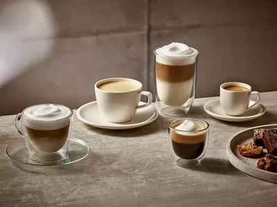 Met één druk op de knop op jouw eigen Siemens espresso volautomaat, zet deze cappuccino met versgemalen bonen, waarvan de perfecte verhoudingen ook nog eens voor te programmeren zijn. De klassieke verhoudingen zijn eenderde espresso, daarna eenderde gestoomde melk en er wordt afgetopt met eenderde opgeschuimde melk.