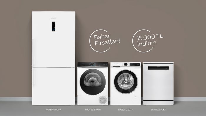 Baharın tazeliği evinde başlasın. Siemens’te 4’lü beyaz eşya alımına özel 15.000 TL indirim fırsatıyla yaşam alanını akıllı teknolojilerle dönüştür. 30 Nisan’a kadar geçerli bu fırsatı kaçırma!